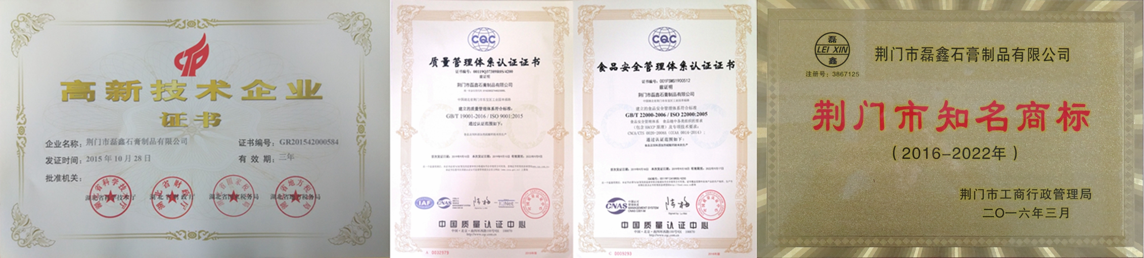 國家高新技術企業!湖北省專精特新中小企業!湖北省支柱產業細分領域隱形冠軍培育企業!湖北省守合同重信用企業!湖北省兩化融合示范企業!荊門市知名商標!中國高純、高白、高亮、超細硫酸鈣(石膏)生產基地!中國取得《食品生產許可證》的食品添加劑硫酸鈣(石膏)供應商!中國取得《飼料添加劑生產許可證》和《產品批準文號》硫酸鈣供應商!中國取得《出口飼料生產、加工、存放企業檢驗檢疫注冊登記證》飼料添加劑硫酸鈣供應商!通過ISO9001國際質量管理體系認證!通過ISO22000國際食品安全管理體系認證!通過HALAL國際清真認證!通過KOSHER猶太認證! 荊門市磊鑫石膏制品有限公司成立于2002年,位于石膏資源富集的湖北省荊門市東寶區工業園幸福路,占地27000余平方米,是一家在業內享有盛譽的集石膏、石膏粉和硫酸鈣制品研發、生產、銷售于一體的高新技術企業。公司擁有 “磊鑫”、“杰普生”、“凱氏蘇特”等5個國家注冊商標,2個發明專利,18個實用新型專利,50余篇自有技術應用研究,36篇權威期刊發表技術論文。主要產品有:醫藥級硫酸鈣、食品級硫酸鈣、飼料添加劑硫酸鈣、人造石透明填充粉,凱色粉、涂料及化妝品功能性填料和特級半水纖膏粉、混合石膏粉、模型石膏粉,建筑石膏粉等九大系列50余種產品。公司享有自營進出口權,客戶遍布全世界,是多家公司、集團和世界500強企業的優秀供應商!產品遠銷到韓國、日本、俄羅斯、中國臺灣、東南亞、歐美、中東、非洲等國家和地區。公司緊靠207國道,焦柳鐵路穿境而過,距漢江碼頭50公里,長江沙市港90公里。交通運輸便利,確保及時供貨。“待用戶為上帝誠信為本,視質量為生命持之以恒!”是我們的企業宗旨,與我們合作是您明智的選擇,共謀發展是我們共同的目標!歡迎垂詢,歡迎惠顧! Your Trusted Source For Food-Grade Calcium Sulfate!——做全球更好的食品級硫酸鈣(石膏)供應商!          ——CGC·磊鑫石膏